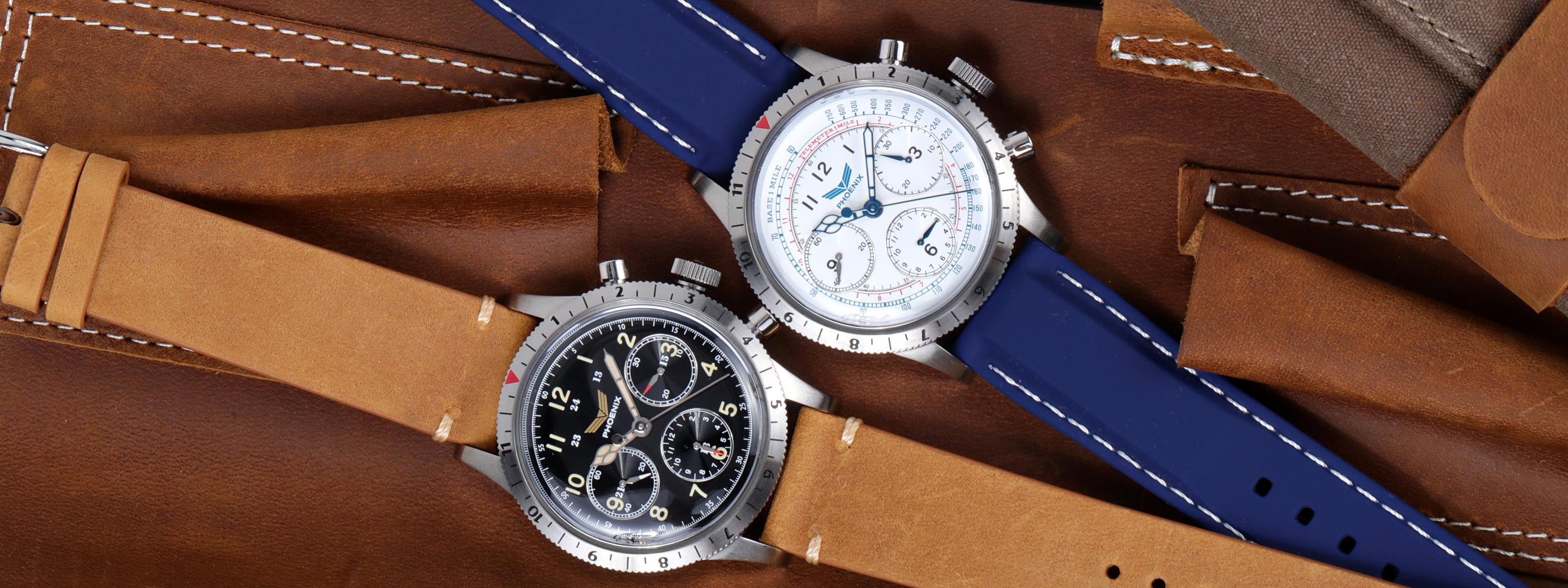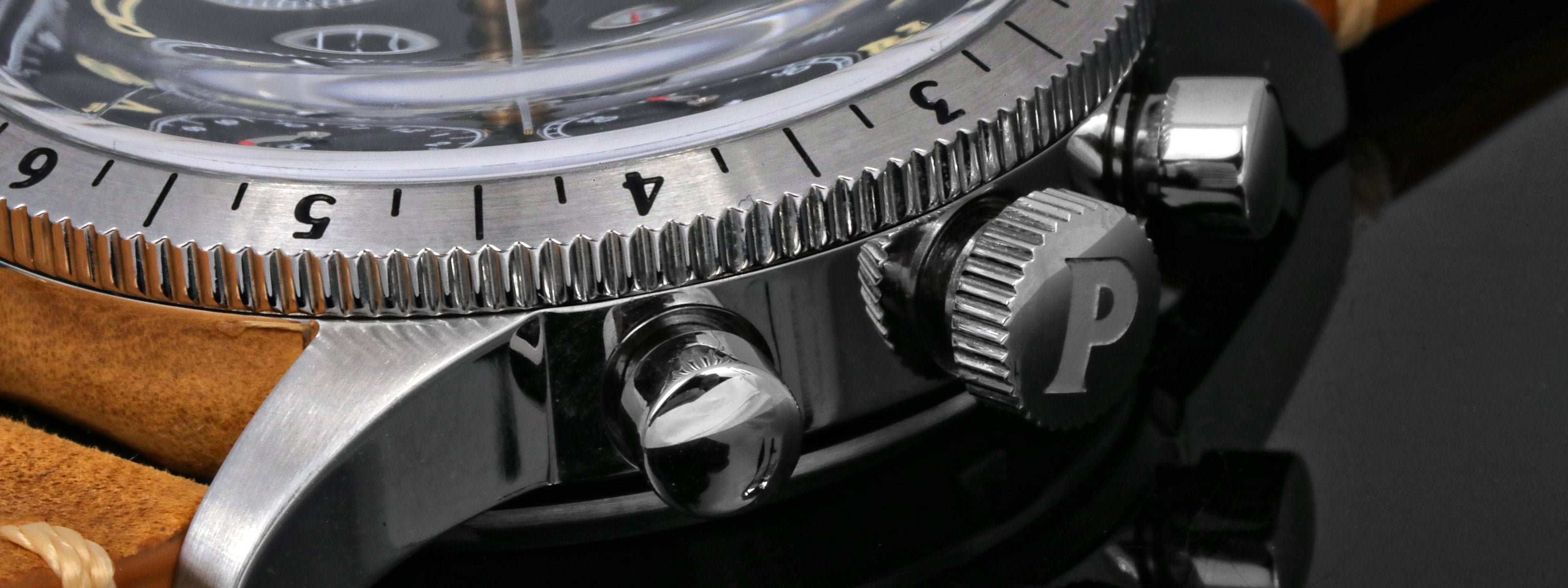 For our first timepieces we explored thousands of designs from a long list of both American and European classic pilot watches. Once we agreed on a short list of design cues to incorporate into our watches, we then had to determine which engine to put inside our fuselage. Our Chief Technical Officer and Master Watchmaker "MJ" dissected samples from several companies including Concepto, Selitta, Soprod, and La Joux Perret. For this retro-pilot layout he landed on one of the finest chronograph movements available: La Joux Perret's LJP L112. Additionally MJ would go on to inspect each element and component under a microscope and pre-production samples were improved until we had a full kit of components that passed the MJ battery of tests.
